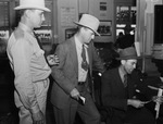 Interested in the proof of the success of the sale of choice Coleman County, Texas, beeves as recorded by the adding machine were, left to right, Vocational Instructor O. W. Myers, County Agent D. D. Steele and Grady Richardson. They are all wearing hats. Mr. Myers is wearing a shirt, trousers and a tie and is holding a cigar in one hand. Mr. Steele and Mr. Richardson are wearing suits. Mr. Steele is holding a journal and pen in his hand and Mr. Richardson is seated, holding the sale records.