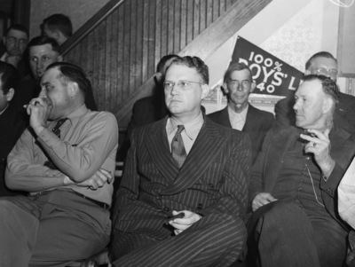M. K. Berry, center, president of the Herring National Bank of Vernon, Texas, and chairman of the agricultural committee of the city's chamber of commerce, at the Wilbarger County 4-H Club livestock show. He is sitting in a chair, wearing a striped suit and eyeglasses and is holding a cigar. Unidentified people are sitting to his left and right and behind him. In the background is a stairway.