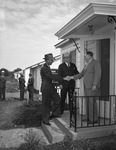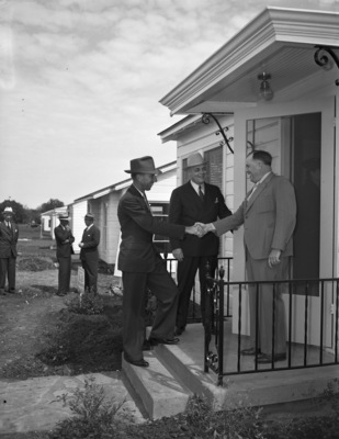 E. T. Stearns, left, regional director of the F. H. A., and A. A. Lund, president of Chamber of Commerce, and Joe Driskell, right inspecting low-cost housing unit that will go on the tax rolls as a homestead rather than a tax-free government housing project as part of new FHA plan whereby a builder may take title to the property and sell for little or no down payment. Joe Driscoll is welcoming them into the house, which is in the 4000 block of Lovell street, one of more than 100 being planned and erected by several contractors.