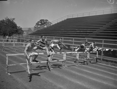 Leonard Roach, Masonic Home and School hurdler (far left), shown setting a new record of 15.2 seconds in the high hurdles in the regional high school track meet at Denton, Texas. Roach and four other athletes are shown in the midst of jumping over a row of wooden hurdles. Each of the runners are wearing running shorts and shoes. Roach and the athlete in the center are shirtless and the other three are wearing tank tops. Behind them, other rows of hurdles can be seen. At the far right is a chain link fence separating the bleachers from the track.