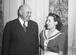 Officials of the Gulf Oil Corporation and Gulf Refining Company gathered at the Fort Worth Club for the annual service awards banquet. L. P. Garrett, Houston, Texas, left, vice president of the corporation, is shown with Durelle Van Alexander Zandt, former singer with Paul Whiteman, whose husband is an employee of the corporation. Mr. Garrett is wearing a suit and Durelle is wearing a blouse and skirt. They are standing in a room in front of a wall.