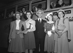 Some of the wives and companions of three companies of the 144th infantry who went to Brownwood, Texas, and Camp Bowie to visit their men soldiering at the 36th Division training camp. The round trip, complete with chaperons, was arranged by the Fort Worth, Texas, Junior Chamber of Commerce. Standing left to right are Miss Frances Vaughn, who helped register the women at the commerce office; Miss Oneta Smelser, Denton, Texas, who went to see Corporal John Wise, Fort Worth, Texas, Company B; Jack Bates, general chairman for the Jaycees; Miss Louise Robertson, Fort Worth, Texas, date of Corporal William G. Wells, Service Company; and Mrs. Metha Hamilton, Midlothian, Texas, who went to visit her husband in the Service Company. They are standing in front of a bus. Miss Vaughn and Miss Smelser are wearing blouses and skirts, Mr. Bates is wearing a striped suit, and Miss Robertson and Mrs. Hamilton are wearing dresses.