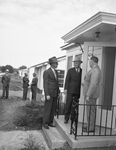 E. T. Stearns, left, regional director of the F. H. A., and A. A. Lund, president of Chamber of Commerce, and Joe Driskell, right inspecting low-cost housing unit that will go on the tax rolls as a homestead rather than a tax-free government housing project as part of new FHA plan whereby a builder may take title to the property and sell for little or no down payment. Joe Driscoll is welcoming them into the house, which is in the 4000 block of Lovell street, one of more than 100 being planned and erected by several contractors. Published in the Fort Worth Star-Telegram morning edition April 27, 1941.