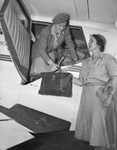 Ruth Nichols, right, holder of three records for women pilots and the first woman airline pilot in the United States, shown with her secretary Miss Mercedes Ormston. Miss Nichols is shown here in her capacity as executive of Relief Wings, a humanitarian air service, standing beside her plane at Municipal Airport. Miss Ormston is exiting the plane and is handing her a briefcase. Both women are wearing collared shirts, skirts and hats.