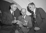 Delegates arrived from all over Texas for the grand conclave of the Grand Commandery, Knights Templar of Texas. Three of the leaders looking over a conclave program are, left to right, Claud Cross, Fort Worth, Texas, general chairman of arrangements; Edward D. Rutledge, Fort Worth, Texas, deputy grand commander, who is slated for the highest office of the order in Texas; and Kennedy Clapp, Lubbock, Texas, grand senior warden. All three men are sitting down and are wearing suits. Mr. Rutledge is holding a cigar in one hand. Mr. Cross and Mr. Clapp are wearing eyeglasses.