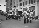 Knights Templar of Texas paraded before hundreds of onlookers in downtown Fort Worth, Texas, as a feature of their 88th conclave. Shown is a shot of a unit executing a difficult drill step. Three men at the front of the unit are holding flags, including an American flag and a Texas flag.