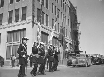 The Knights Templar of Texas paraded before hundreds of onlookers in downtown Fort Worth, Texas, as a feature of their 88th conclave. Shown are color bearers for one of the divisions. They are standing in front of the Star-Telegram building, holding flags. There are automobiles and unidentified people in the background.
