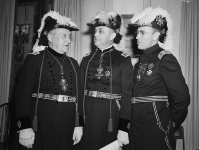 Three of the ranking officers of the Knights Templar of Texas who attended a memorial service at First Christian Church in the memory of 155 knights who have died during the last 12 months. Left to right, they are Harry Gilmore Pollard, Lowell, Massachusetts; John Temple Rice, El Paso, Texas; and Hale Clyde Selter, Greenville, Texas. The men are standing, wearing uniforms.