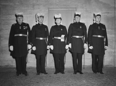 Captains of five Knights Templar crack drill teams are shown as they prepared for the annual championship competition at Farrington Field. Left to right, they are W. W. McClellan, Dallas, Texas, Commandery No. 6; Gus Meyer, San Antonio, Texas, Commandery No. 7; V. C. Whitfield, Tancred Commandery No. 82, Dallas, Texas; Don Gray, Worth Commandery No. 19, Fort Worth, Texas; and J. B. Clayton, De Molay Commandery No. 20, Greenville, Texas. All five are standing in front of wall, wearing uniforms. The contest was won by Tancred Commandery in Class A, and by De Molay Commandery in Class B competition.