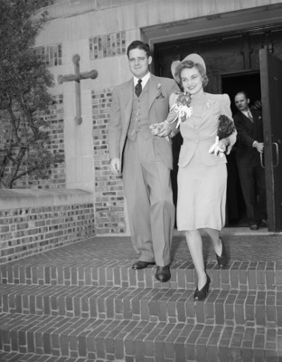Mr. and Mrs. James Henry Trigg, as they left the Trinity Episcopal Church after their wedding. The bride is the former Miss Clintie Bee Steffens, daughter of Mr. and Mrs. W. Lon Steffens of Abilene, Texas. The bridegroom is the son of Dr. and Mrs. Henry Trigg of Westover Hills, Texas. The couple is walking down the steps outside of the church, holding hands. James is wearing a suit and his wife is wearing a dress, blazer and a hat. Pinned to her blazer is a brooch and a large floral accessory. There is an unidentified person at the church door in the background.