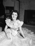 Image shows Miss Mary Louise Butcher, daughter of Mrs. Erwin T. Herbert, will be the duchess from Fort Worth, Texas, at the annual Cotton Ball at Texas Agricultural and Mechanical College. Miss Butcher is wearing a long, off-the-shoulder dress. She is sitting on the floor and the skirt of the dress is spread around her in a circle. She is also wearing a pendant necklace. To the right is a chair and behind her is a fireplace. Published in the Fort Worth morning edition April 27, 1941.