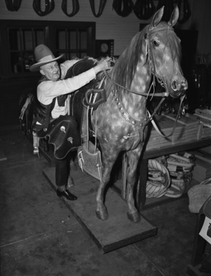 Steve Tierney shown mounting a wooden horse in preparation for his role as chief wrangler for the Spring Round-Up party to be given at Pioneer Palace by Monsignor Robert M. Nolan, of the Knights of Columbus. Mr. Tierney is dressed in cowboy apparel that includes a cowboy hat, leather chaps and a vest. The fake horse is adorned in a saddle and bridle.