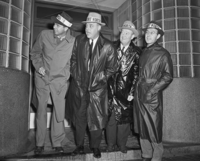 Four of the 30 Fort Worth, Texas, boosters who left by bus to attend the East Texas Chamber of Commerce convention in Corsicana, Texas. The four peering out of the Chamber of Commerce doorway are, left to right, Jimmie Branan, E. D. Kruger, Roy Jones and Taylor O'Hearn. They are wearing trench coats and hats with labels reading "Fort Worth."
