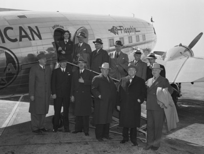 Mayor McCrary of Fort Worth, Texas, was among this group of mayors who boarded an American Airlines plane in New York for a flight to Ottawa, Canada, for a series of joint sessions with the Canadian Conference of Mayors on civil defense. Standing in the front row, left to right, are William H. Dress, Evansville, Indiana; Ben E. Douglas, Charlotte, North Carolina; Daniel W. Hoan, a member of the Council of National Defense, Washington, D. C.; I. N. McCrary, Fort Worth, Texas; Damase Caron, Manchester, New Hampshire; and O. M. Mosier, American Airlines Executive. In the back row are Stewardess Elvira Laine, Joseph D. Scholtz, Louisville, Kentucky; John J. McDonough, Saint Paul, Minnesota; John J. Burns, Burlington, Vermont; John B. Gage, Kansas City, Missouri; and Paul V. Betters, executive director, United States Conference of Mayors. All the men are wearing suits and hats. The stewardess is wearing a blazer and a bow-tie. They are standing in front of a plane.