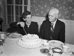 Mr. and Mrs. Miles Westbrook, shown cutting cake, celebrated their 53rd wedding anniversary, Mrs. Westbrook's 71st birthday, and another meeting with the Pioneer Women's Club of Eastland, Texas, of which Mrs. Westbrook is a charter member. The couple is sitting at a table, and Mrs. Westbrook is cutting a piece of cake. On the table is a variety of tableware. Mrs. Westbrook is wearing a dress and Mr. Westbrook is wearing a suit.