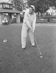 Texas Christian University (TCU) golfer, Darrell Palmer, who played Worth Hills golf course in his "warmup suit" and track shoes. He is wearing a hat and is holding a golf club, ready to take a shot. There are benches and a building in the background