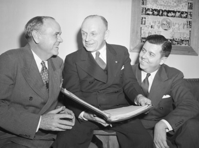 These three officials were pleased when Fort Worth, Texas, civic leaders voted unanimously for the organization of a Civitan Club. Seated left to right are W. N. Tolleson, of Dallas, Texas, president of the Dallas Civitan Club and governor of the Texas District, Civitan International; Arthur Cundy, Birmingham, Alabama, secretary of Civitan International; and Glenn Williamson, who was elected president of the Fort Worth, Texas, group. The three men are sitting on a couch and are wearing suits. Mr. Cundy has a folder open on his lap.