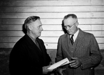 Tom Gillis (left), past district governor of Lions International, presents the charter for the new Azle, Texas chapter to H. H. Sampson, president of the new unit. The ceremony took place at the Azle school gymnasium. Mr. Gillis and Mr. Sampson are both holding the charter. They are both wearing suits and neckties. This photograph was published in the April 25, 1941 morning edition of the Star-Telegraph.