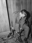 Russell F. Meyer, secretary of Optimist International, is in a three-piece suit and tie, sitting in a chair, and is putting on a cowboy boot. Published in Fort Worth Star-Telegram.