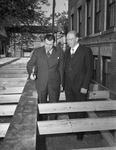 J. L. Nelson, left, president of the Men's Bible Class of Central Methodist Church, hammering a nail into the frame structure being built under sponsorship of the class to provide a meeting place for Boy Scouts of the church. With him, right, is Reverend J. W. Simmons, a teacher. The two men are standing among the frame structure between planks of wood. Both men are wearing three-piece suits with ties and Reverend Simmons is also wearing eyeglasses.