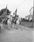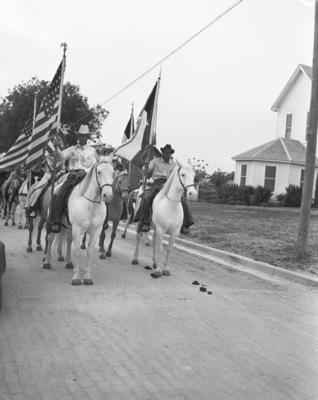 Riding on horses, left to right, are Rusty McGiney, holding a United States flag, and Bill Hughes, holding a Texas flag. They are heading a parade at the Dublin, Texas, World's Championship Rodeo. Both men are wearing shirts, trousers and cowboy hats. Behind them are unidentified people riding horses.