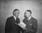 Doctor L. R. Scarborough (left), president of Southwestern Baptist Theological Seminary, and T. N. Carswell, of Abilene, Texas, attended the inaugural ceremonies for Doctor W. R. White as the seventh president of Hardin-Simmons University. The two men are standing in front of a wall, facing each other, both wearing suits and eyeglasses. Mr. Carswell is holding a copy of the program for the inauguration.