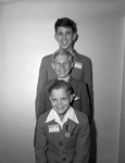 Winners in the annual junior oratorical contest sponsored by the Seventh District Optimist International. Top to bottom, they are James Dixon, 16, of Shreveport, Louisiana, Bill Riley, 14, of Fort Worth, Texas, and Hilliard Herod, 14, of Dallas, Texas. James was the first place winner, Bill won third place and Hilliard won second place. They are standing against a blank wall, all wearing suits.