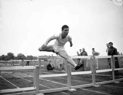 Marsh Farmer, former Texas Tech University hurdler from Aledo, Texas, running an exhibition high hurdles race at a triangular track meet between Texas Christian University (T. C. U.), Southern Methodist University (S. M. U.), and Baylor University. Farmer is shown in the midst of leaping over a row of wooden hurdles. His left leg and right arm are extended forward. He is wearing a pair of shorts and a t-shirt. Beside the track, at right, a few people are watching the race. Farmer finished the high hurdles in 14.6 seconds.