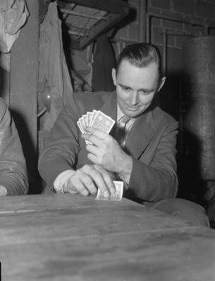 Earl Caldwell, Fort Worth Cats pitcher, playing cards in the Cats' clubhouse. Caldwell is sitting at the end of a wooden table, holding up a hand of playing cards. He has one card face down on the table and has flipped it up to look at it. Caldwell is wearing a dark suit and a striped tie. Behind him, a brick wall can be seen.