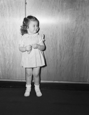 Sharon Marshall, daughter of Mr. and Mrs. William Marshall, of 3809 Linden Street. She is wearing a hand-made batiste dress with a white lace collar and cuffs. She is standing in front of a wall, looking to the side.