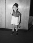 David Gibbs, son of Mr. and Mrs. Frank Gibbs of Lake Worth, Texas. He is wearing white gabardine pants, a blue gabardine shirt with military buttons on the pockets and down the front, and a blue linen military cap. He is standing in front of a bare wall.