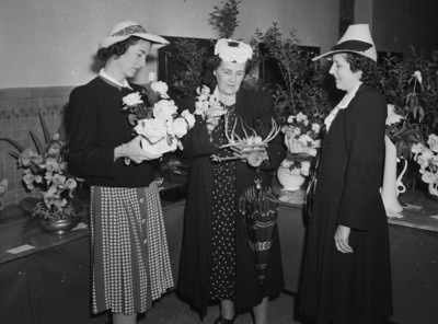 The three judges at the North Fort Worth Garden Club flower show held at North Side High School were, left to right, Mrs. Julian Meeker, Mrs. Frank Naugle and Mrs. C. S. Bigham. They are all wearing dresses and hats, and Mrs. Meeker and Mrs. Naugle are wearing coats. Each of them are holding a potted plant. Behind them are various flowers and plants atop counters.