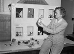 The North Fort Worth Garden Club held its flower show at North Side High School. Here is Mrs. Clint Shirley, chairman of the show. She is sitting on a table, holding a miniature vase with flowers. She is wearing a collared shirt, blazer and trousers. On the table and on a decorative shelf behind her are several miniature flower vases and potted plants.