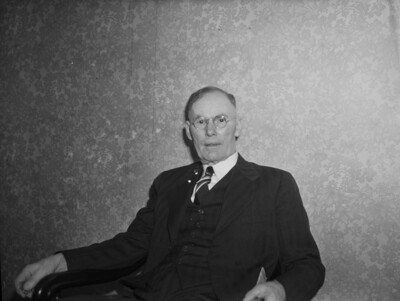 Charles R. Harifield, of Oklahoma City, Oklahoma, attended inaugural ceremonies for Doctor W. R. White as the seventh president of Hardin-Simmons University at Abilene, Texas. Mr. Harifield is sitting in front of a wall, wearing a three-piece suit and eyeglasses.