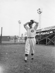 Fort Worth Cats pitcher Earl Caldwell. Caldwell is standing on a baseball field with his hands on the top of his head. He is wearing a Fort Worth Cats uniform that has the team's logo on the front of the jersey. He is also wearing a dark baseball cap and a baseball glove on his left hand. Behind him, the bleachers can be seen.