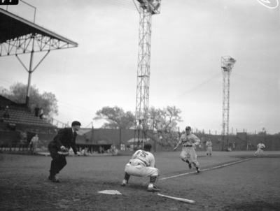 Milt McDougal, number 15, Fort Worth Cats catcher, shown knelt down near the base as another player runs towards him. McDougal has his back to the camera. Both men are wearing their respective team's baseball uniform; on the back of McDougal's jersey is the number "15." In the background, at the right, a few other players can be seen on the field, and at the left is the umpire. Also in the background are several spectators seated in the bleachers, watching the game.