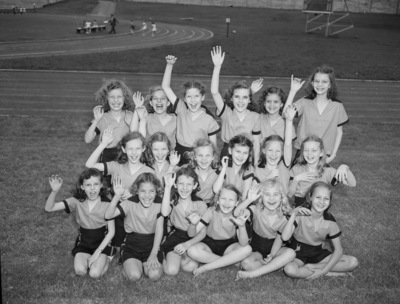 The girls' Class D relay team of Polytechnic Elementary School pictured just after they set a new record of 2:19 in the elementary track meet at Farrington Field. The team members are, left to right, first row: Patricia Brandt, Evelyn Culp, Jeannine Hetto, Nancy Enlow, Patsy Brit, Joyce Atkinson; (second row, left to right) Betty Jo Dearing, Artie Fae Brooks, Joan Averitt, Marjorie McManus, Betty Kelly, Roxie Brooks; (third row, left to right) Norma McGuire, Grace Harris, Betty Alice Messer, Edith Gray, Bettie Jo Coke and Doris Doley. The girls are all wearing matching track uniforms; dark running shorts with short-sleeve, v-neck shirts. Most of the girls have their hands up in the air. Behind the group, the rest of the athletic field and race track can be seen.