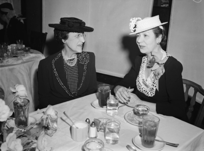 The Fair Store Style Show is being held at the Baker Hotel in Mineral Wells, Texas. The models are showing some of the season's top new fashions. Attending the luncheon and watching the fashion show are left to right, Mrs. Watt Page and Mrs. W. H. Simpson. Mrs. Page is from Austin, Texas. She is wearing a hat, polka-dot, blouse, blazer, and a pearl necklace. Mrs. Simpson is the wife of Brigadier General Simpson, stationed at Camp Wolters in Mineral Wells. She is dressed in a straw hat with flowers and a blouse with a lace collar.