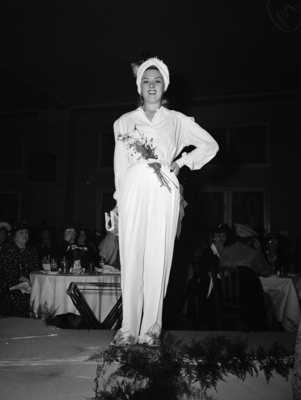 The Fair Store Style Show is being held at the Baker Hotel in Mineral Wells, Texas. The models are showing some of the season's top new fashions. Miss Joyce Clayton Phillips is modeling white slacks, white turban, and a silk blouse. There is a bouquet of daisies in her belt. She is walking down the runway with a hand on her hip. A crowd of people are sitting at round tables in the background.