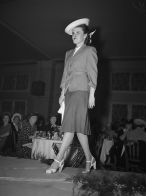 The Fair Store Style Show is being held at the Baker Hotel in Mineral Wells, Texas. The models are sporting some of the season's top new fashions. Miss Christine Stone is walking down the runway, showing a sailor style hat, a blazer tied around the waist, and a pleated skirt. Spectators are seated at tables in the background, enjoying the luncheon and fashion show.