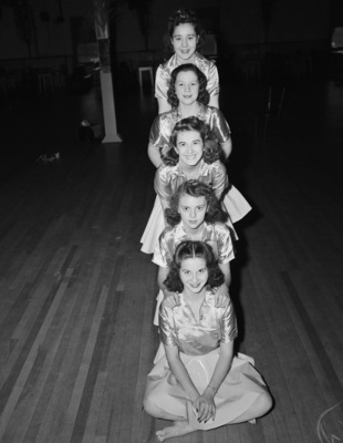 (Reading upward) Misses Mary Jane Brown, Mary Lee Prescott, Eleanor Reich, Charlotte Greene and Audrey Owings, dancers who will perform a "Huckelberry Duck" sequence at the Delta Beta Sigma (D. B. S.) Juke Box Review at Municipal Auditorium. Miss Brown is sitting on the floor with Miss Prescott kneeling behind her and the rest of the girls standing directly behind each other, slightly bending their knees so each girl's face can be seen. They are wearing blouses and skirts made of yellow satin and oil cloth.