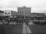 Shot of a crowd, outside, celebrating the golden anniversary of Foard County, at Crowell, Texas. There is a line of buildings in the background.