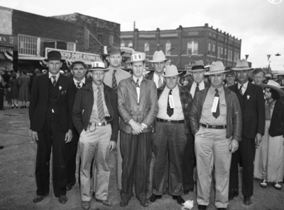 Standing left to right are (front row) Bill Rector, W. L. Martin, Leo Davis, (back row) Carl Schulz, H. A. McCarty, Joe Wolverton, Homer Smith, and Ed Schoppa, at the golden anniversary celebration of Foard County, at Crowell, Texas. Two unidentified men are also in frame. All the men are wearing collared shirts, trousers and cowboy hats. There are various shops and buildings in the background.