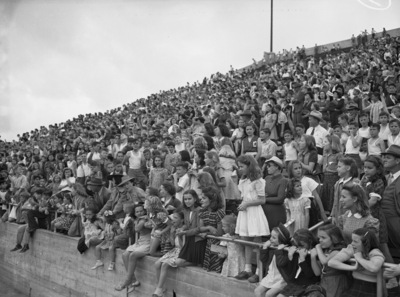 A shot of the crowd of spectators sitting in the bleachers at Farrington Field, watching the Elementary Relays (elementary school track meet).
