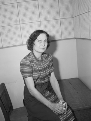 Miss Nellie Rogers, sitting on a desk and wearing a striped dress. She is a resident of a hotel at 1406 1/2 Main Street and a witness to the death of Farris J. (Pat) Kemp, 36. Mr. Kemp was shot to death by his mother, Mrs. Sadie Stewart, 60, after an altercation in the hall of the Main Street hotel, which Mrs. Stewart operates. Miss Rogers told police that Mr. Kemp had threatened to kill her and Mrs. Stewart, and that he had kicked in the door of Miss Rogers's room, beaten her, and cursed his mother while making as if strike her with a crutch.