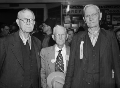 Standing left to right are C. R. Ferguson, T. J. Ferguson, and H. E. Ferguson, early-day cowboys who went to Foard County, Texas, in 1886 and are Crowell, Texas, businessmen, who attended the Foard County golden anniversary celebration at Crowell, Texas. All three men are wearing suits and eyeglasses. T. J. is holding a hat.