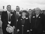 Attendees at the Foard County, Texas, golden anniversary celebration at Crowell, Texas, included, left to right, John E. Raney, Dallas, Texas; Mark Raney, Hedley, Texas; Mrs. Bessie Raney Rexrode, Lockney, Texas; Walter B. Raney, Fort Worth, Texas; and Oliver Raney, Spearman, Texas, who all settled in Foard County, Texas, in 1888. They are standing outside. All the men are wearing suits and Mrs. Raney Rexrode is wearing a dress, coat and a hat.