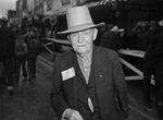 Attendees at the Foard County, Texas, golden anniversary celebration at Crowell, Texas, included Walter Lorance, Vernon, Texas, who came to West Texas in 1879 and worked for S. B. Burnett, W. T. Waggoner and E. C. Suggs. He is standing outside, wearing a cowboy hat and a coat.