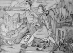 Fort Worth Art Association's Children's Show winning entry in the 15-18 age group is "Where the West Begins," a wax crayon drawing by Russell Byther. In the drawing a young couple is striding forward while a number of Fort Worth and West-related items appear in the background. They include oil derricks, books, cacti, produce, cattle, musical instruments, painting tools, fields, an airplane, city skyscrapers, a water tower, Fort Worth's First United Methodist Church and an unidentified large building. This photograph was published in the May 2, 1941 evening edition of the Star-Telegram.