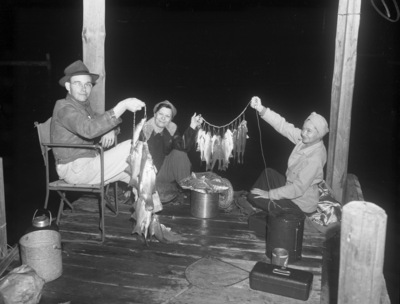 Left to right are anglers Raymond McCarty, Mrs. Iva Estes and Mrs. Henry Love, all of Fort Worth, Texas. The group was participating in the official opening day of a new fishing season. They have all caught their limit for the day. The three are on a dock at night. On the dock if a tackle box, several pails and a light. The two women are holding a string of fish between them. Mr. McCarty is holding his own string. All three are dresses in slacks and jackets. Both women are wearing scarves while Mr. McCarty is wearing a hat while sitting on a camping chair. They are fishing at either Lake Worth or Eagle Mountain This photograph appeared in the May 1, 1941 evening edition of the Star-Telegram.